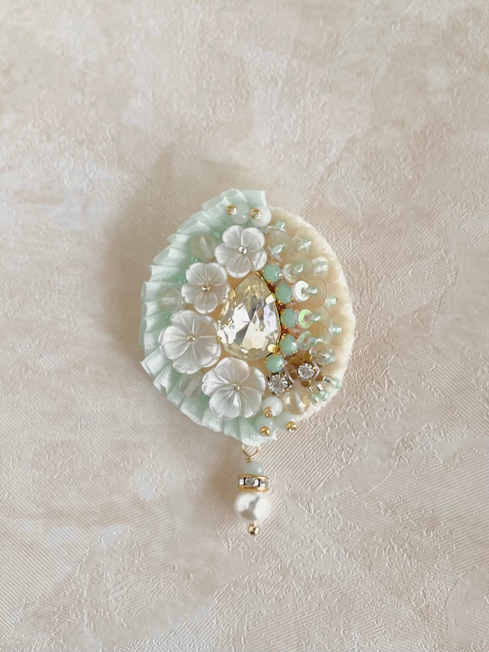 ビンテージガラスの美しさをシェルフラワーやリボン、スパンコールで引き立てた柔らかい印象のブローチ