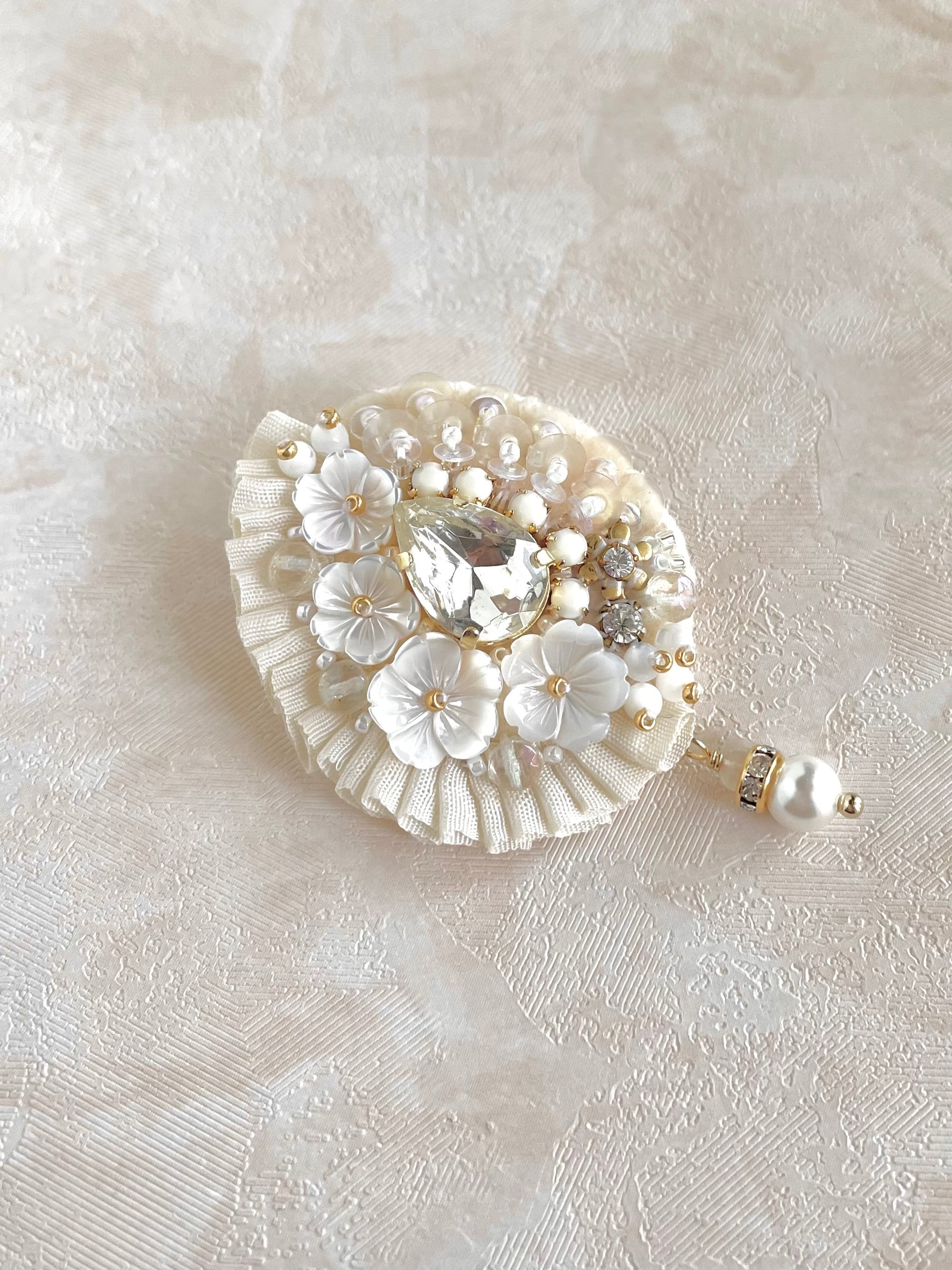 ビンテージガラス、シェル花、ダイヤレーンにスパンコール、そしてリボンプリーツと