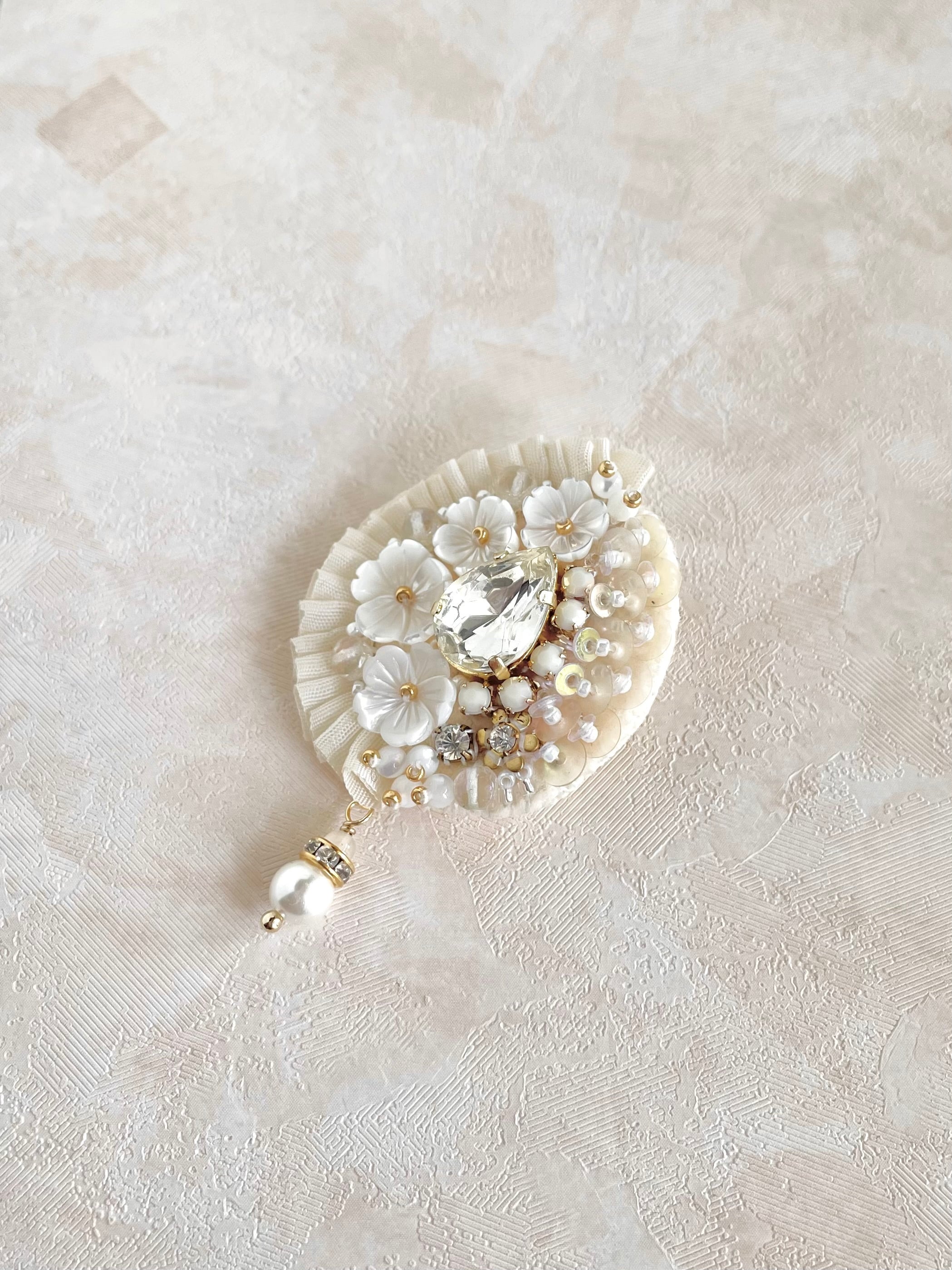 **ビンテージガラスとシェルフラワー ビーズ刺繍 ブローチ **