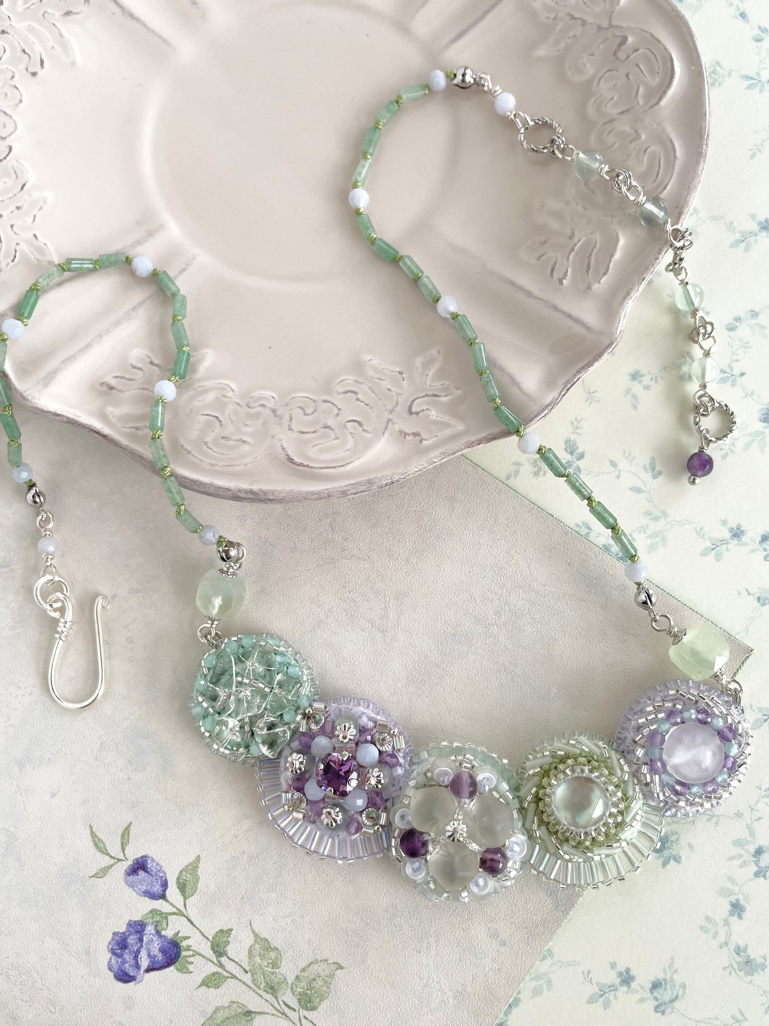 5個の編みモチーフに天然石やビンテージビーズを刺繍して作る贅沢で特別なネックレスです。