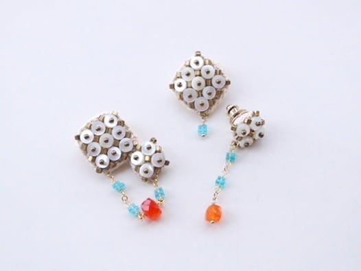 スクエア型の編みモチーフにシェルビーズとメタルビーズを刺繍して、