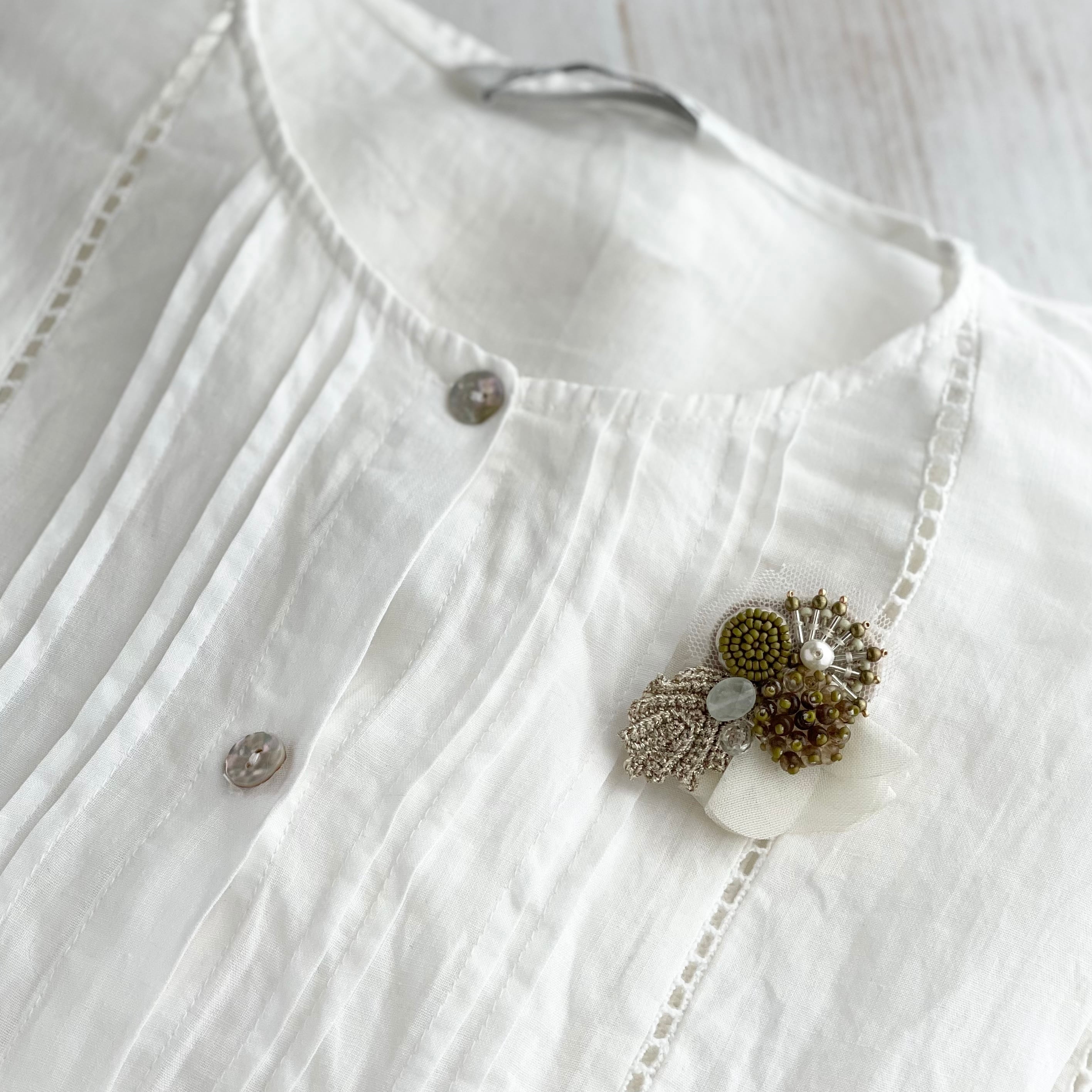 ガラスビーズや天然石、編パーツの葉っぱや、やさしい花びらのようなシフォンなど、いろんな素材を針と糸で縫って作ります。