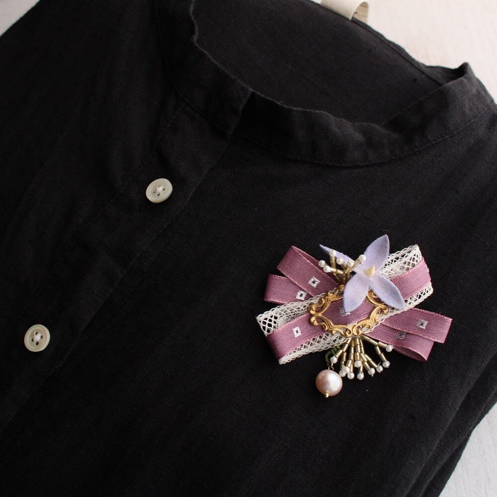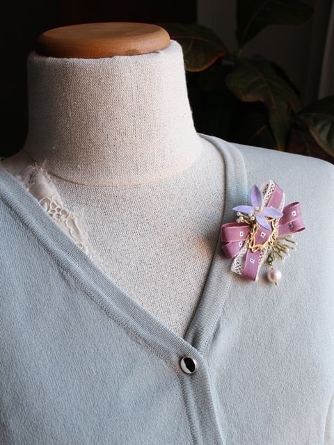 ライラックの布花とイタリア製リボン、ロココ調の繊細なメタルバックルを使ってつくる小さなコサージュを作るキットです。