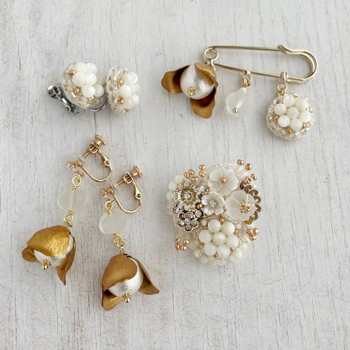 メタルパーツ、天然石(フロスト水晶)、シェル、ガラスビーズ、コットンパール、メタルパーツ、ブローチ金具