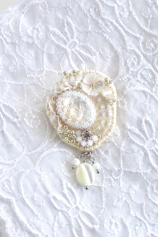 シェルのカボションを粒ビーズで丁寧にフレーミング(粒ビーズによるブリックステッチでカボションを囲む作業)したり、スパンコール刺繍やリボンで繊細なギャザーを作ったり、周りを絹糸で丁寧に巻きかがり縫いをして仕上げています。