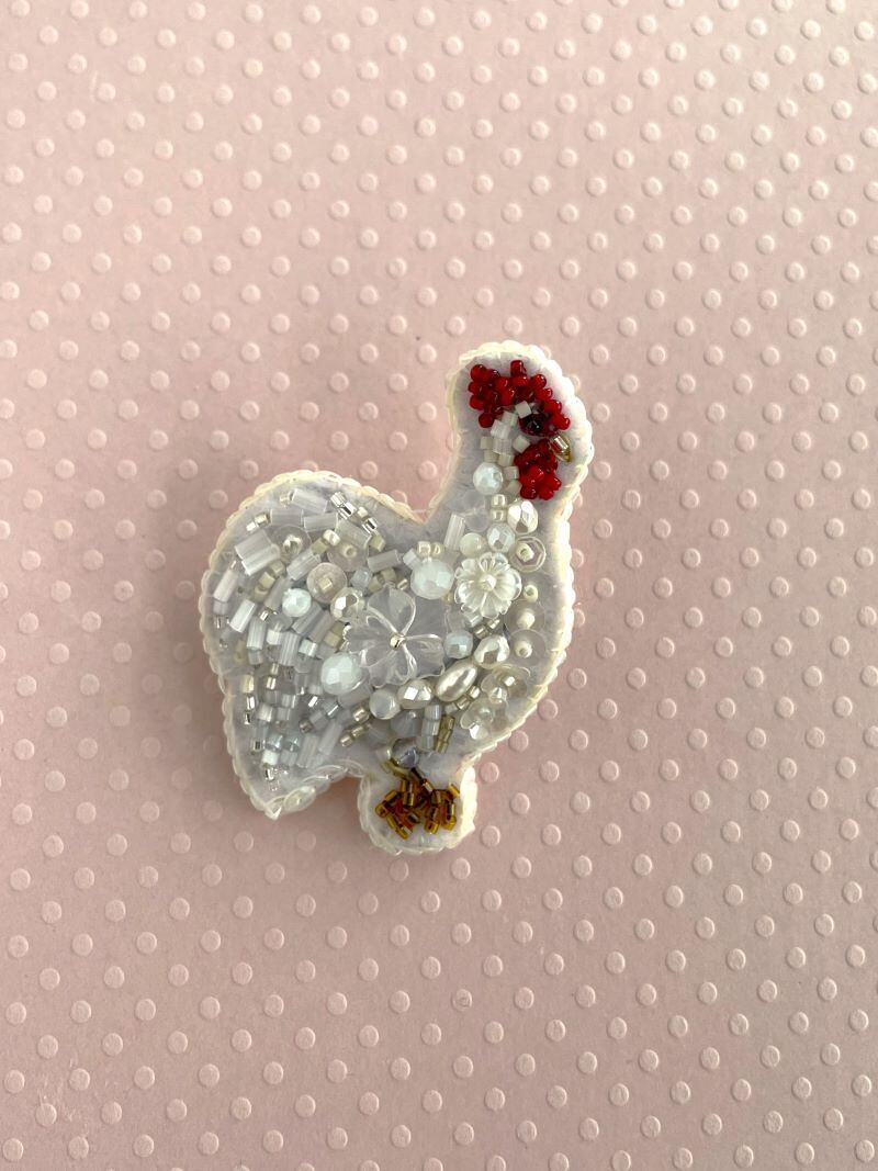 凛とした鶏をテーマにしたビーズ刺繍のブローチ。